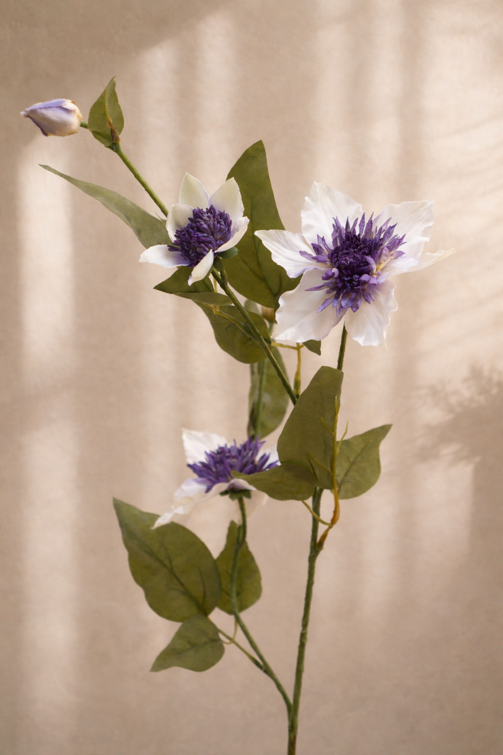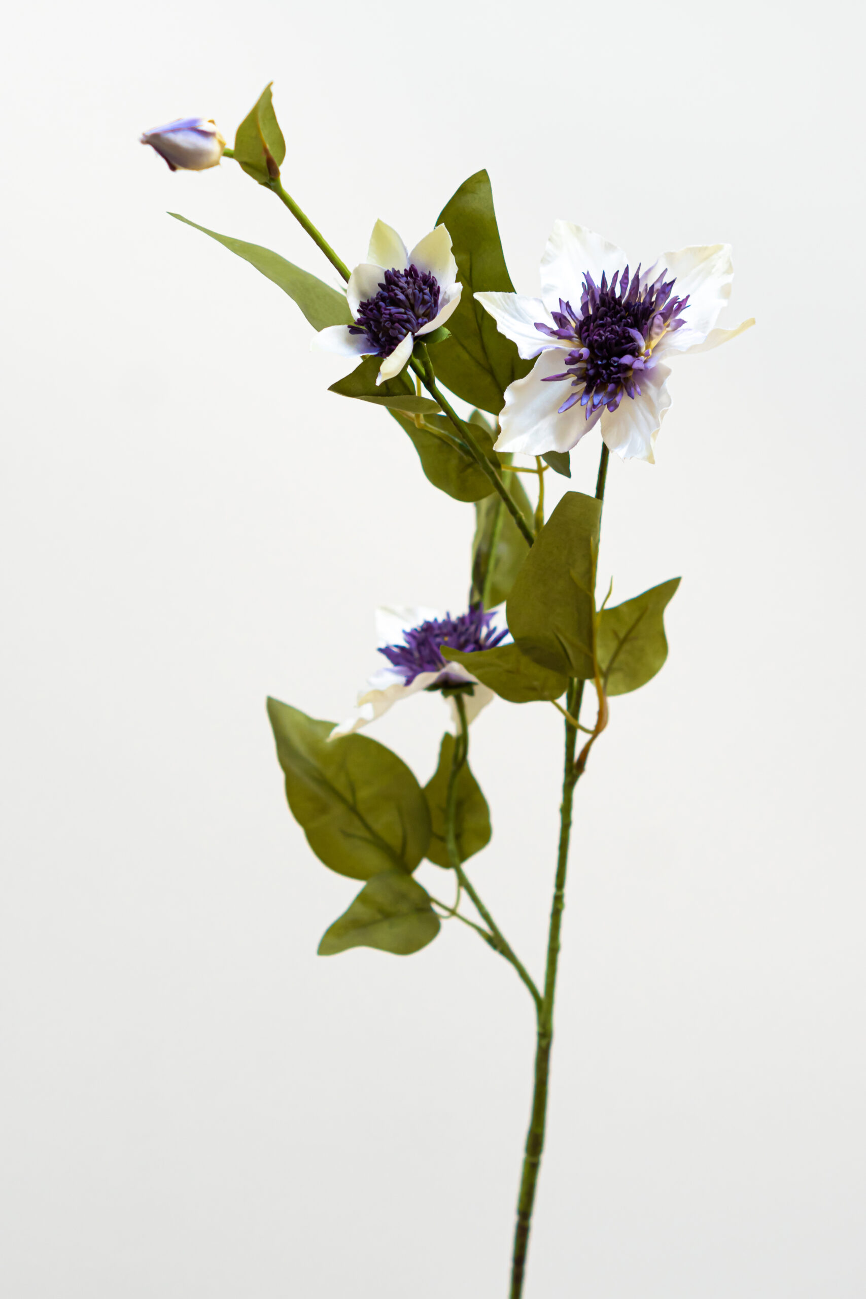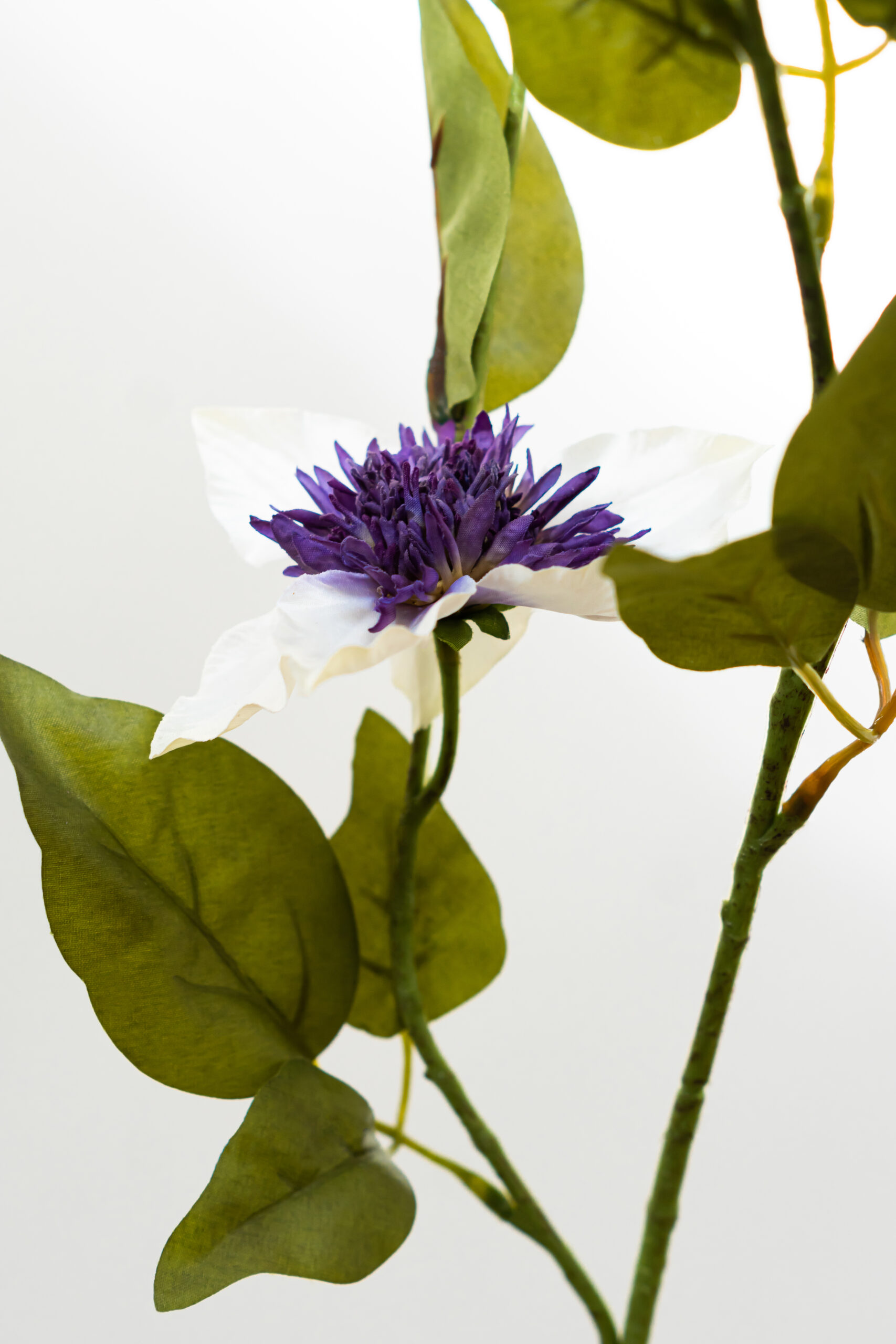 Schitterende Silkflower, de Clematis purple/white. Deze zijden bloem is nauwelijks van echt te onderscheiden en laat zich uitstekend lenen voor een fleurig zijden boeket maar komt ook zeer goed tot zijn recht bij een romantische sfeer.