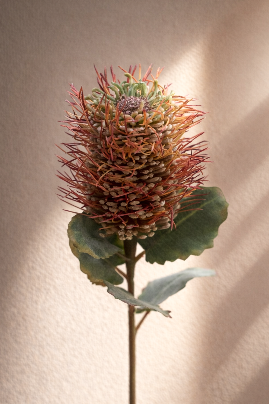 Hybrid Leucospermum Roze/Rood, deze prachtige silkflower met zijn warme kleur is van oorsprong een bloem van het Afrikaanse continent. De zijden bloem heeft een bijzondere vorm en verfijnde uitsteeksels, die prima op zichzelf kan schitteren maar ook een boeket doet opbloeien. Deze bloem steelt onopvallend de show.