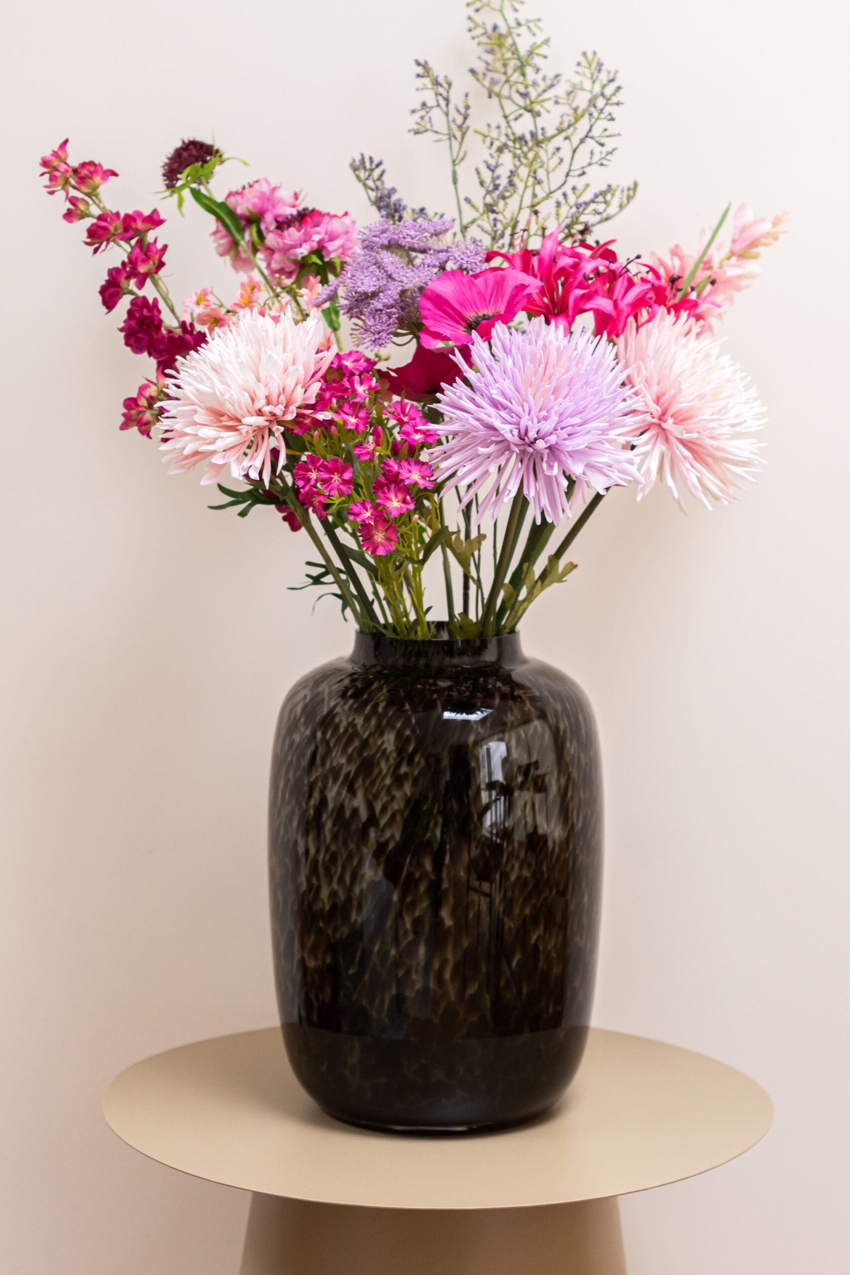 Pink Romance, zachte roze en paarse kleuren maken van dit zijden boeket een prachtig geheel. Hoge en lage zijden bloemen vullen elkaar in dit zijden boeket perfect aan, waardoor je hiernaar kunt blijven kijken. Echt één van onze favorieten.