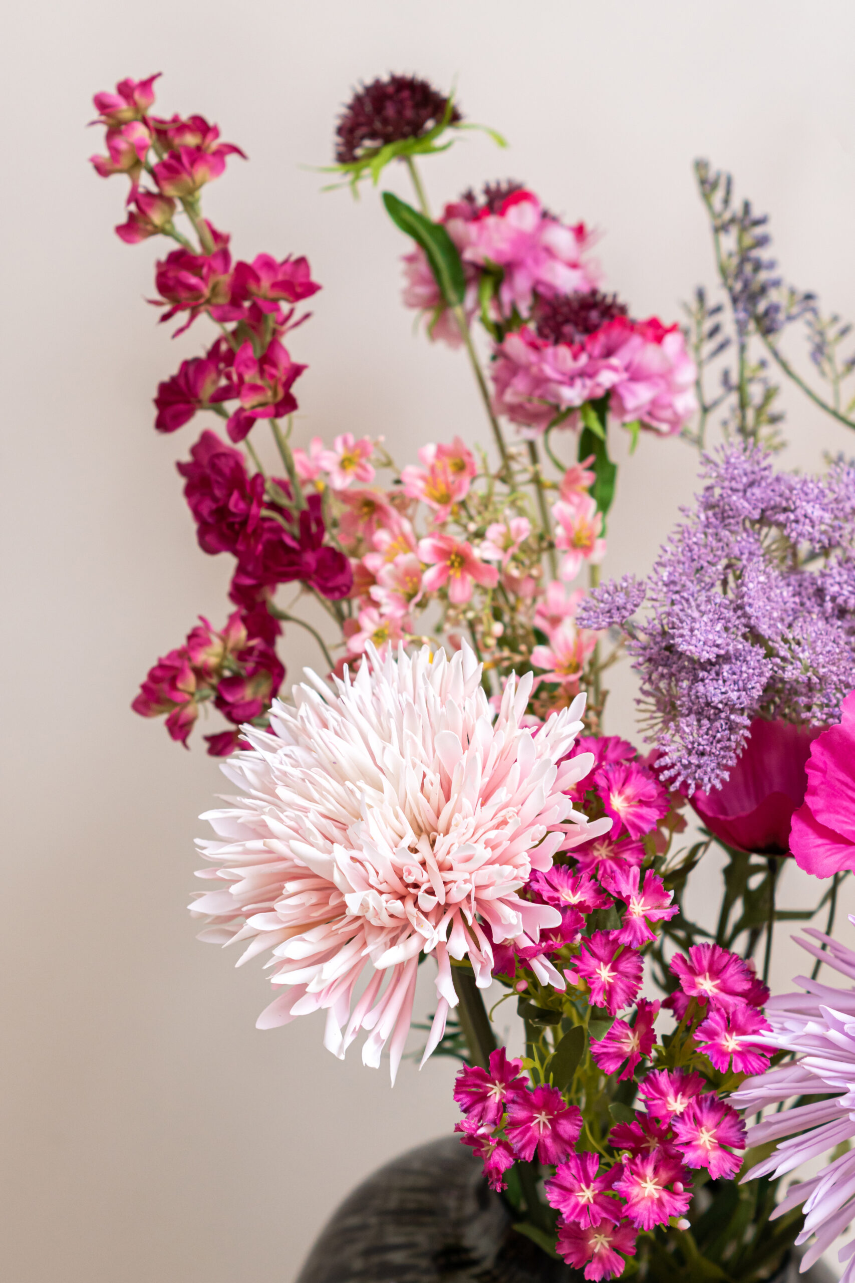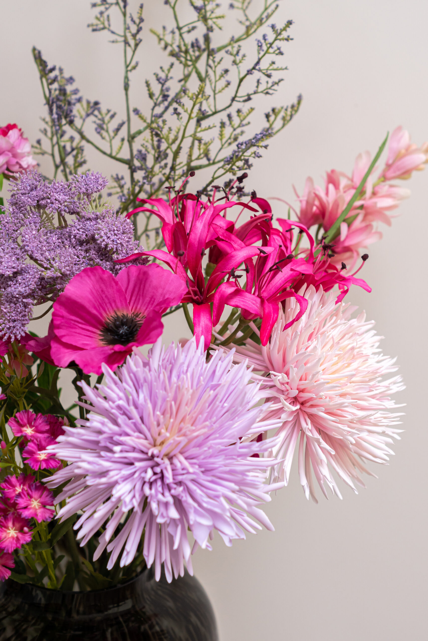 • Dit boeket bevat: 1x Delphinium roze, 2x Chrysant roze, 1x Chrysant paars, 1x Limonium lavender,
