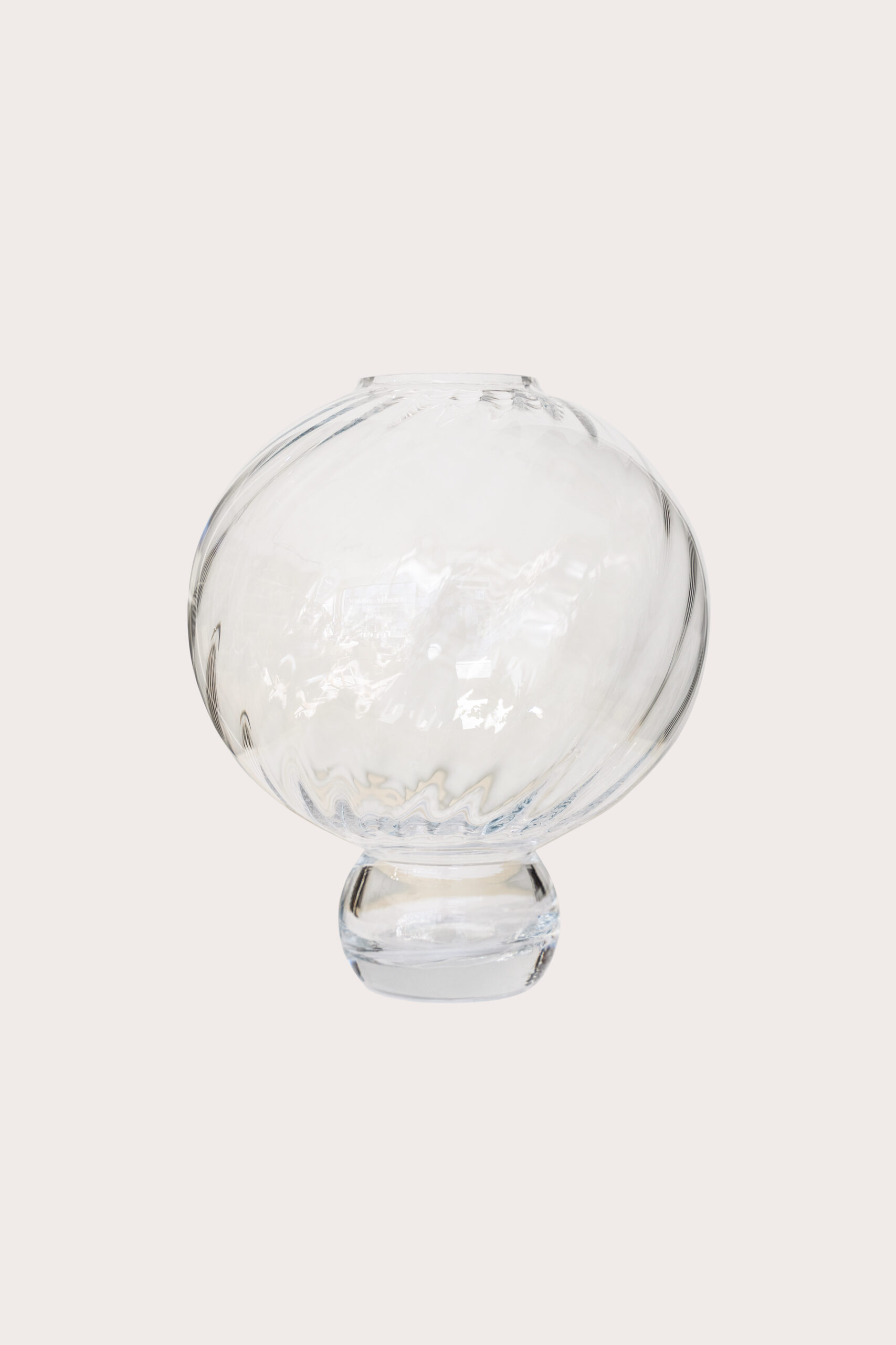 Prachtige bolvase on base gemaakt van glas. Deze leuke elegante vaas is perfect voor een klein zijdenboeket zoals een bosje tulpen. Met zijn prachtige draai-facet steelt hij hoe dan ook de show in je interieur.