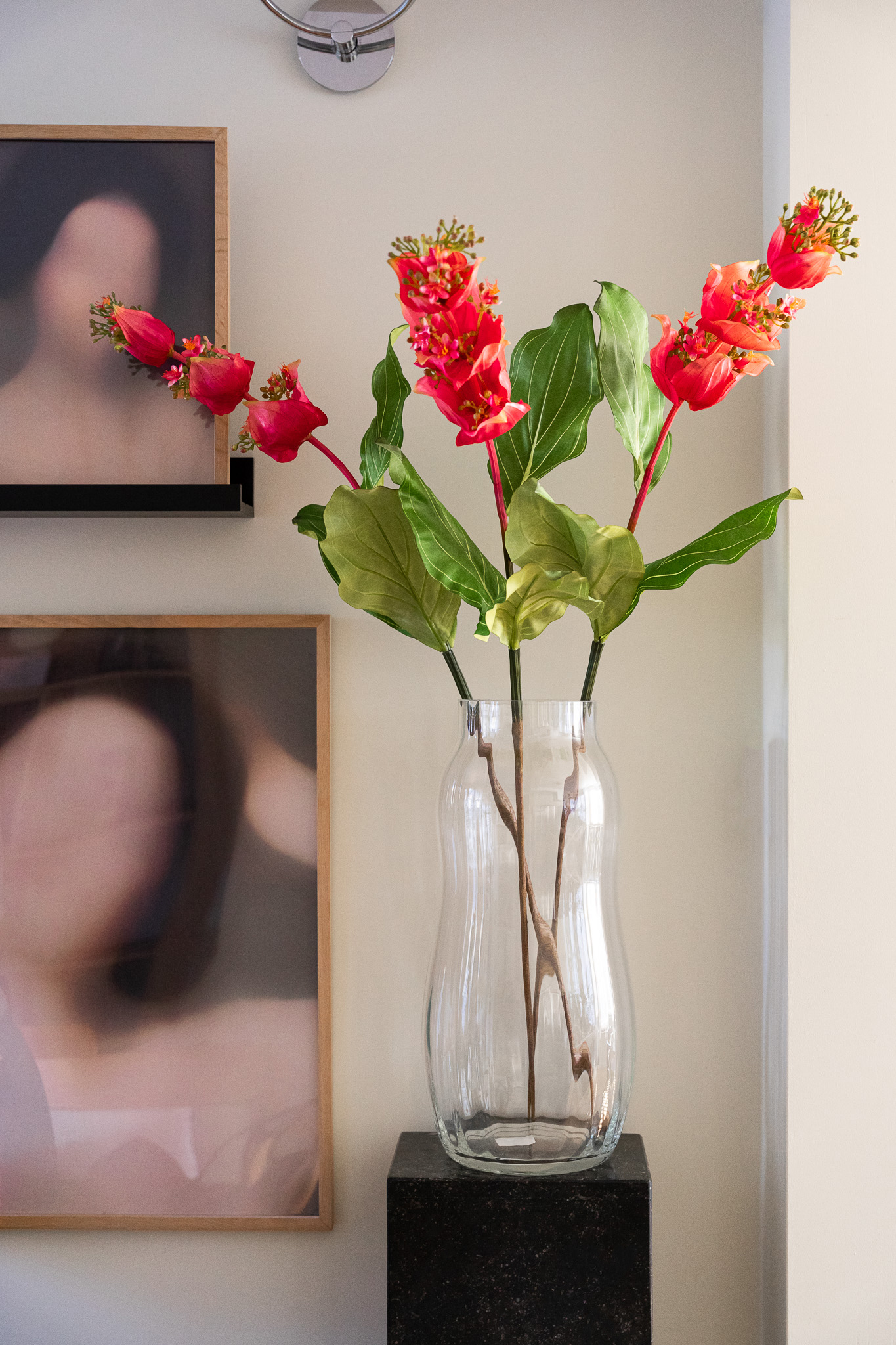Hoge vaas met facet gemaakt van glas. Deze sierlijke vaas heeft een subtiele zandloper vorm. Een perfect model om wat grotere takken of zijden bloemen in neer te zetten. Zet de vaas neer op een mooie pilaar of laat hem de show stelen op je keukeneiland.