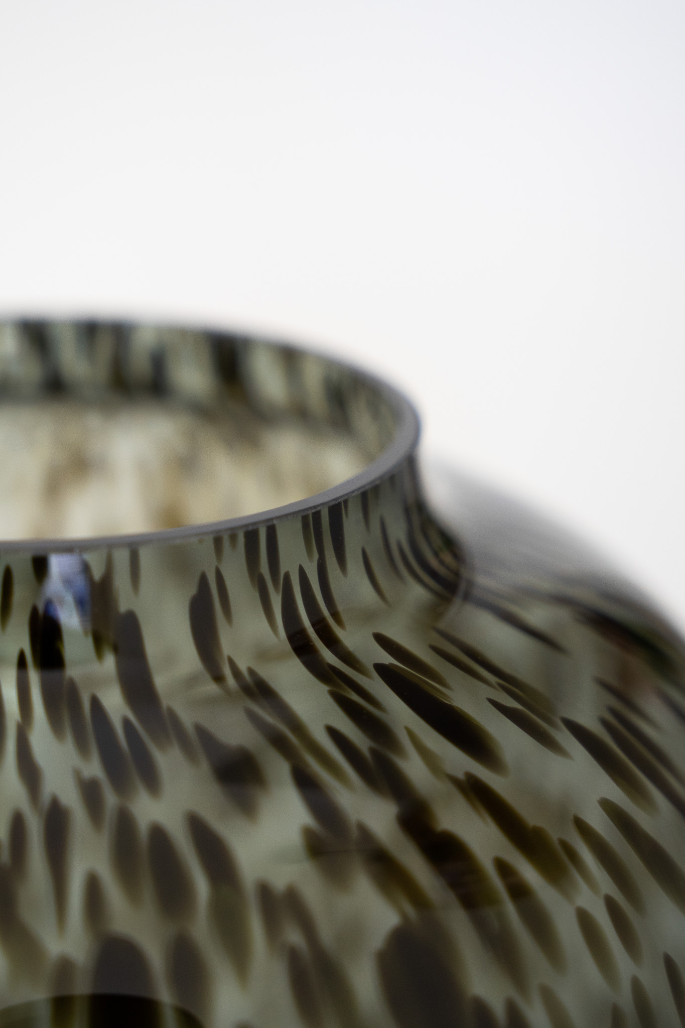 Prachtige vaas in smokey grey met panterprint gemaakt van glas. Een bos zijden bloemen komen helemaal tot zijn recht in deze vaas waardoor hij een van onze favorieten is. De vaas is mondgeblazen waardoor elke vaas uniek en verschillend is.