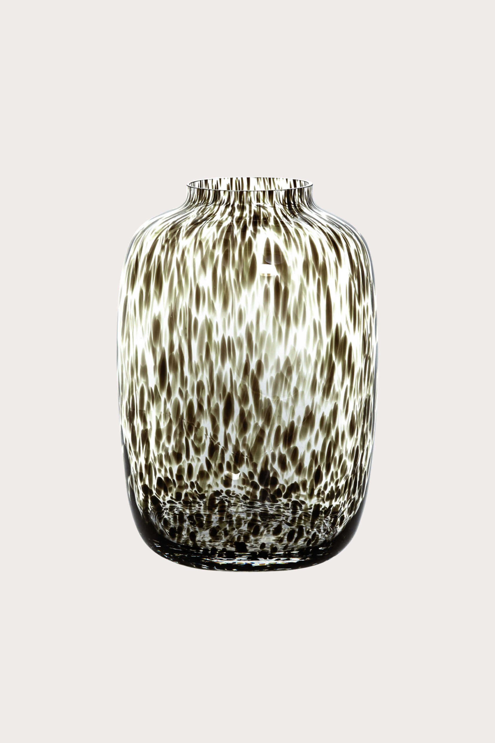 Prachtige transparante vaas met panterprint gemaakt van glas. Een bos zijden bloemen komen helemaal tot zijn recht in deze vaas waardoor hij een van onze favorieten is. De vaas is mondgeblazen waardoor elke vaas uniek en verschillend is. Ook verkrijgbaar met grijze panterprint en in smokey grey.