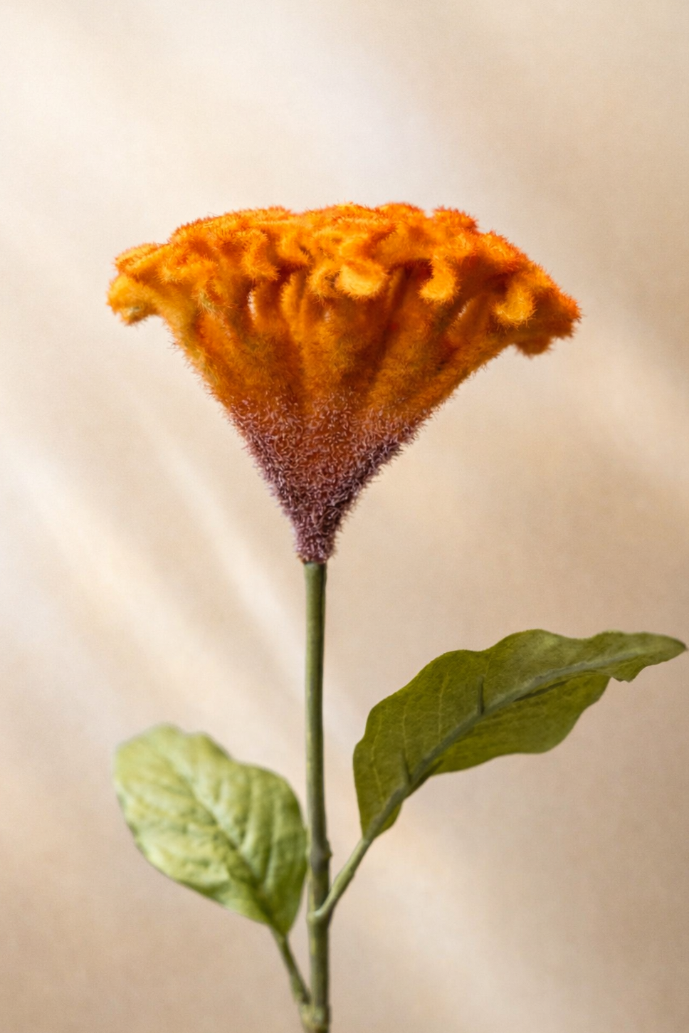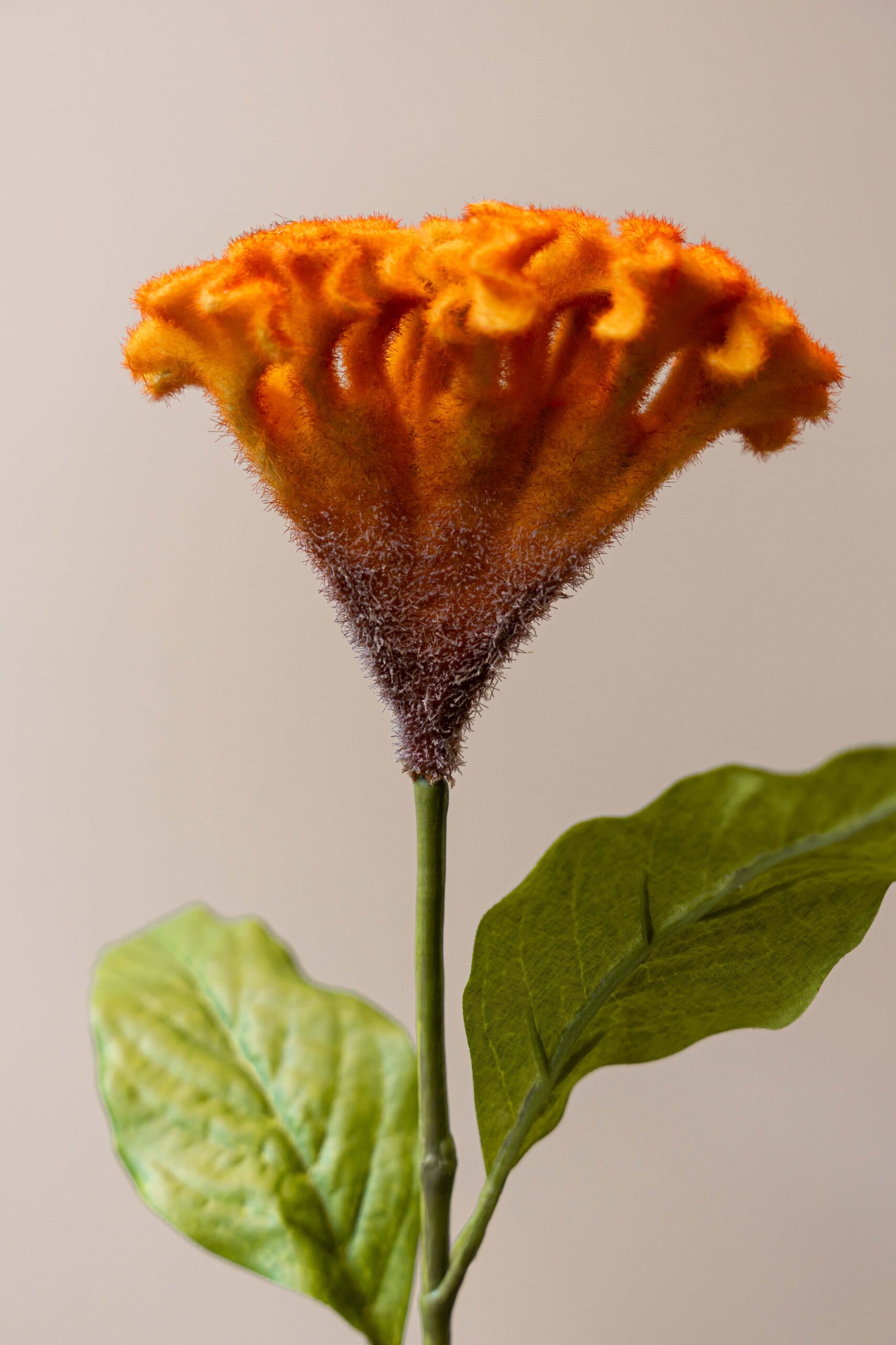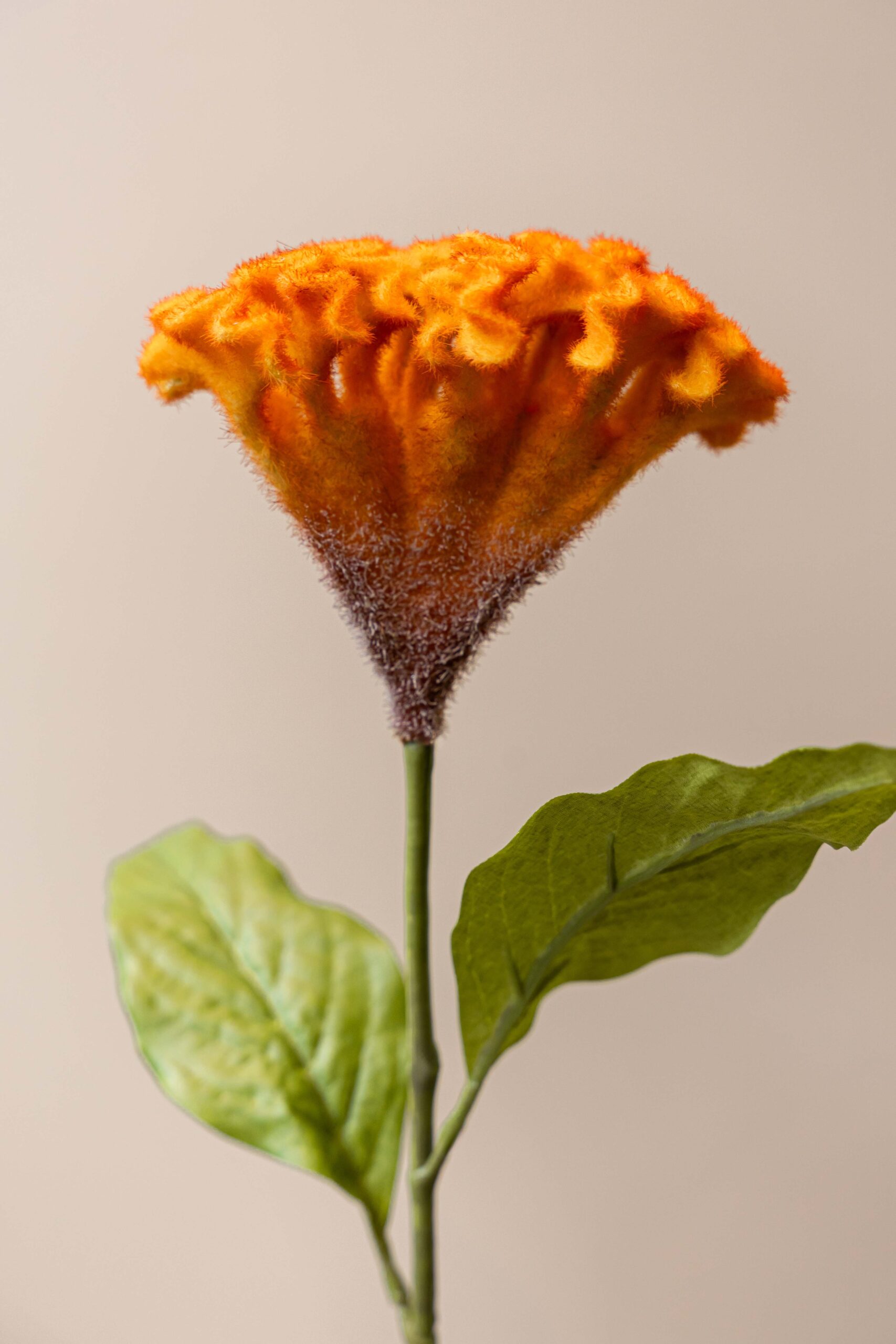 Deze prachtige oranje zijdenbloem ziet er niet alleen levensecht uit maar voelt zo ook aan. De unieke structuur en vorm maken de Celosia, ook wel Hanekam genoemd, tot een echte blikvanger. Staat prachtig in een speels veldboeket, maar ook in een warm winterboeket komt hij helemaal tot zijn recht. Met stip een van onze favorieten! Ook verkrijgbaar in het roze en rood.