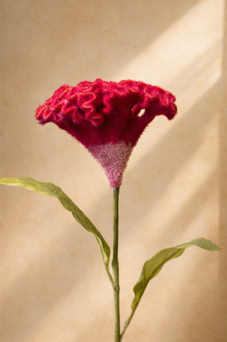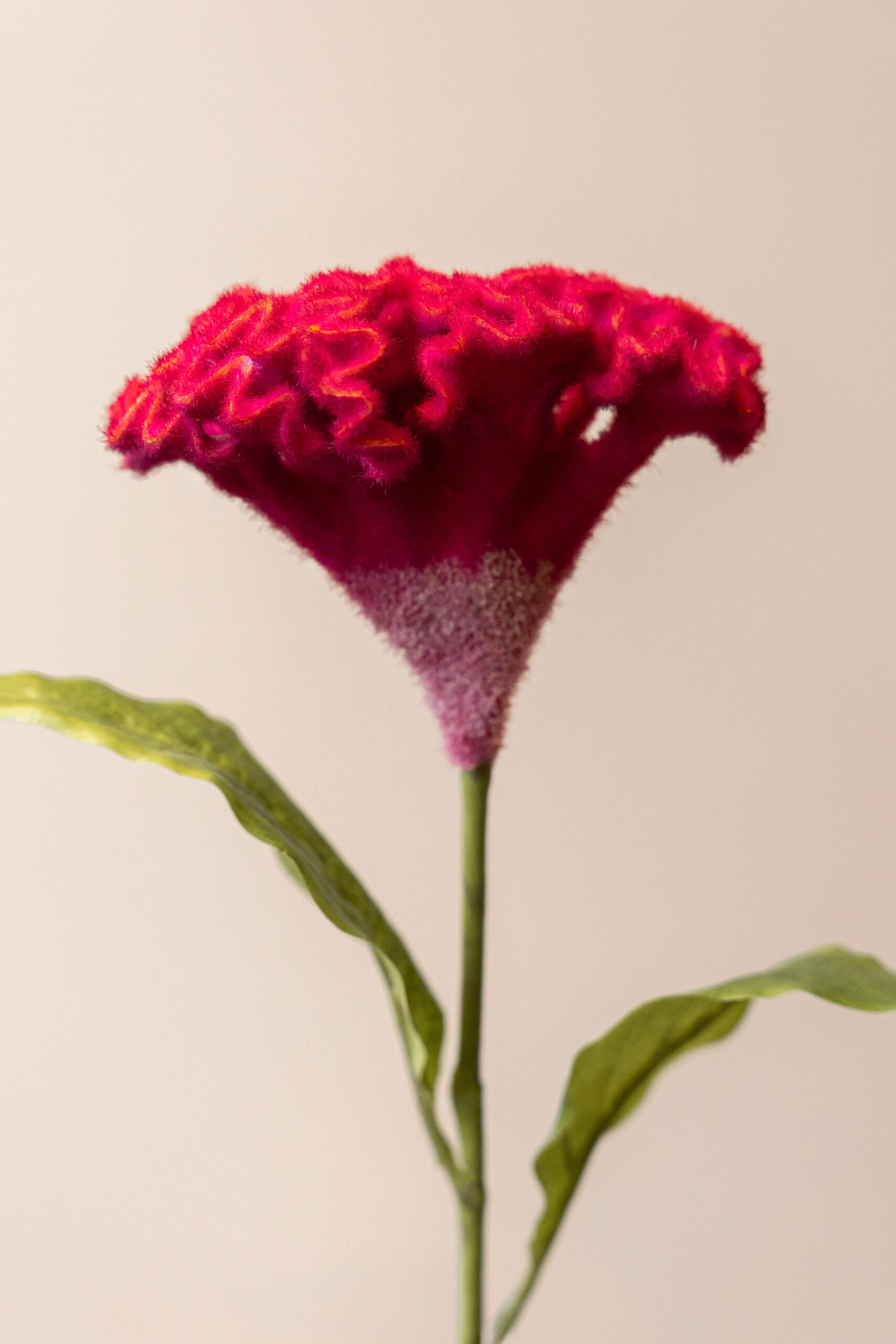 Deze prachtige donkerrode zijdenbloem ziet er niet alleen levensecht uit maar voelt zo ook aan. De unieke structuur en vorm maken de Celosia, ook wel Hanekam genoemd, tot een echte blikvanger. Staat prachtig in een speels veldboeket, maar ook in een warm winterboeket komt hij helemaal tot zijn recht. Met stip een van onze favorieten! Ook verkrijgbaar in het roze en oranje.