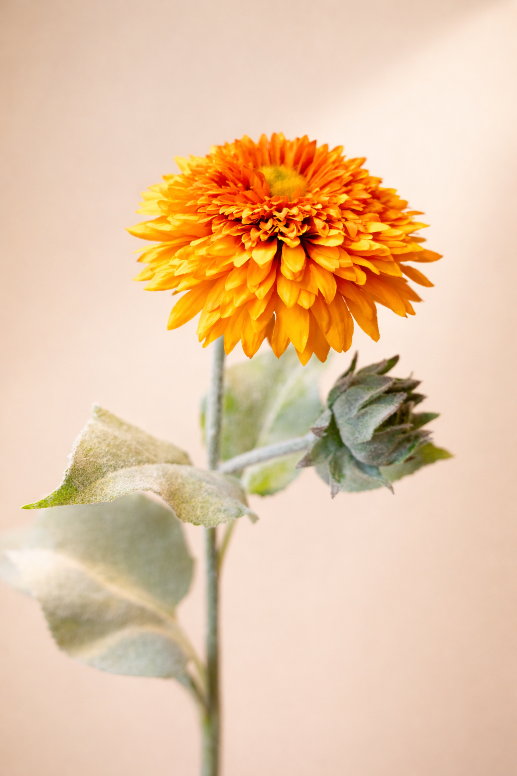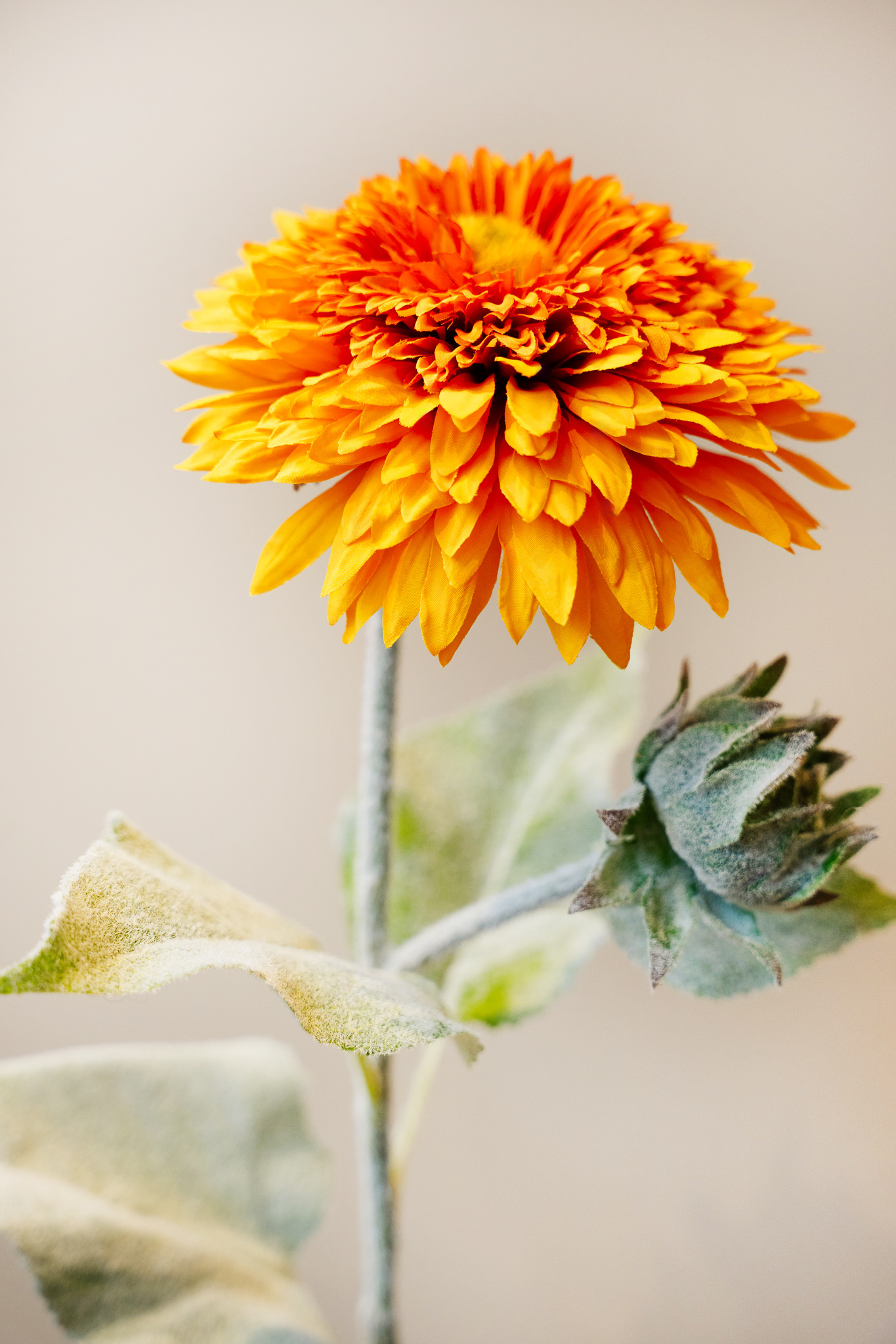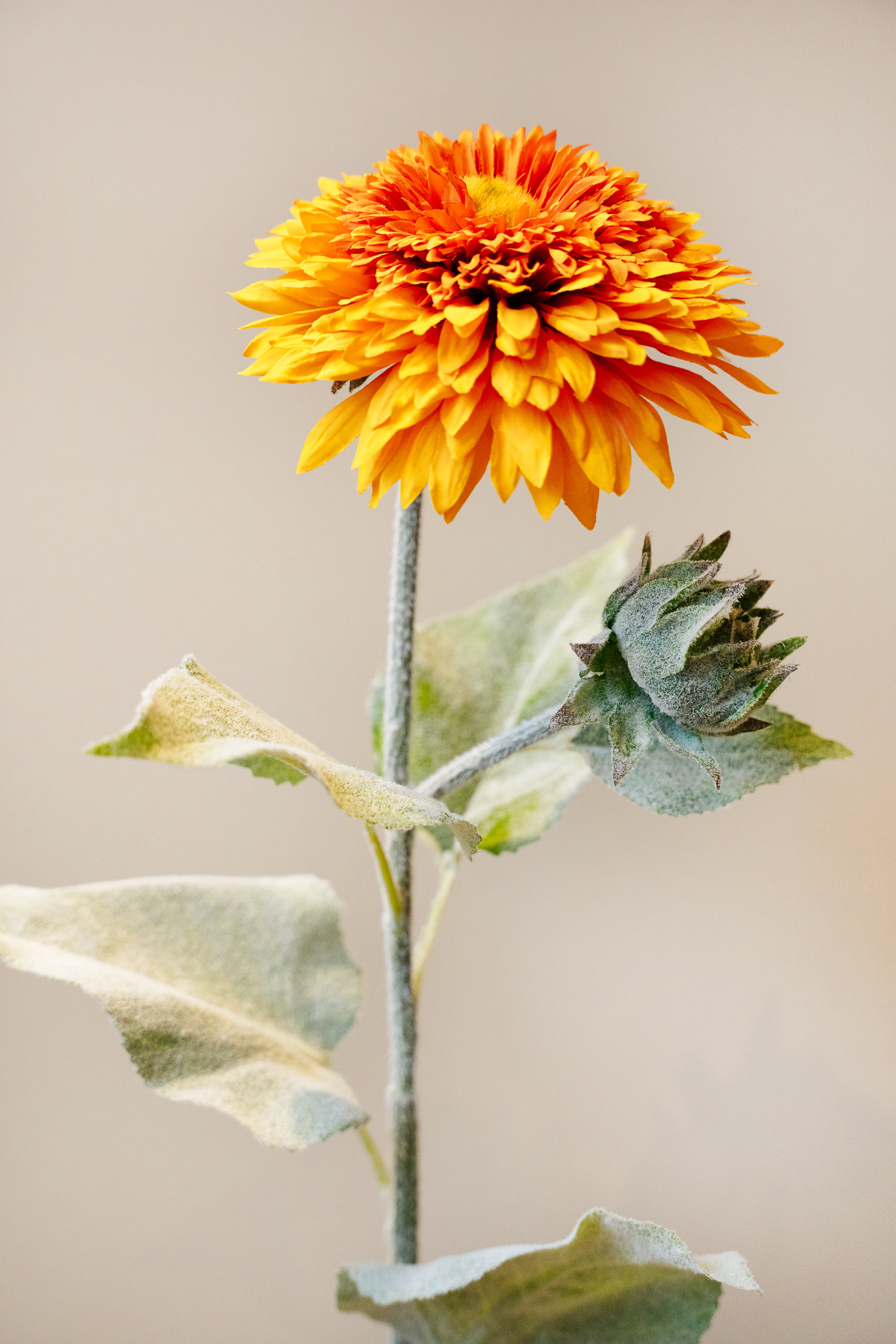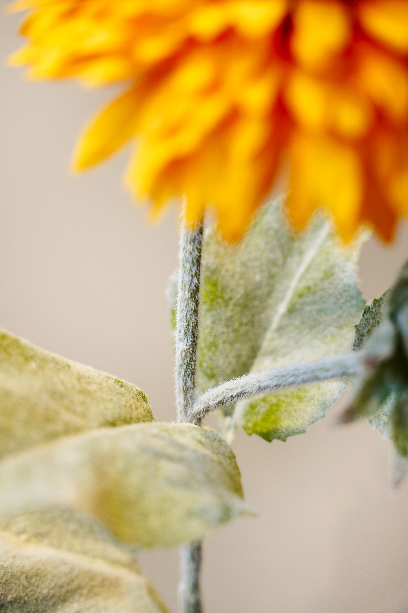 De Mum Chrysant in de kleur oranje is een echte eyecatcher. Deze zijdenbloem heeft mooi fris groen blad en combineert met allerlei verschillende stijlen. Ook verkrijgbaar in het beige en lichtgeel.
