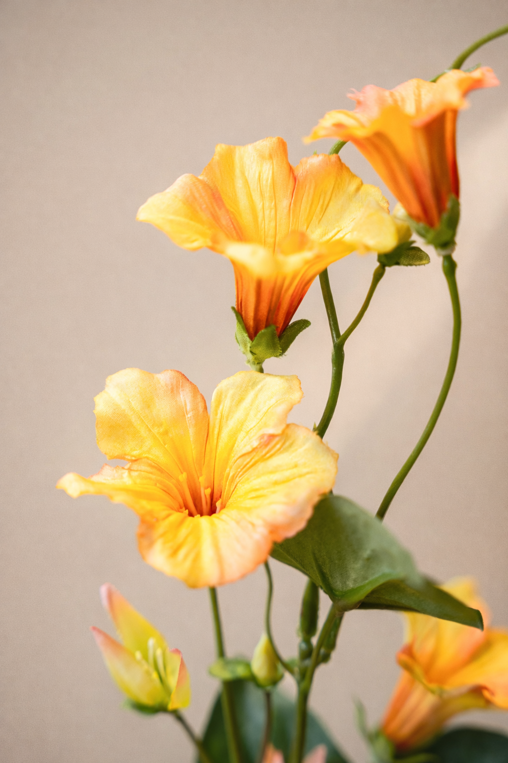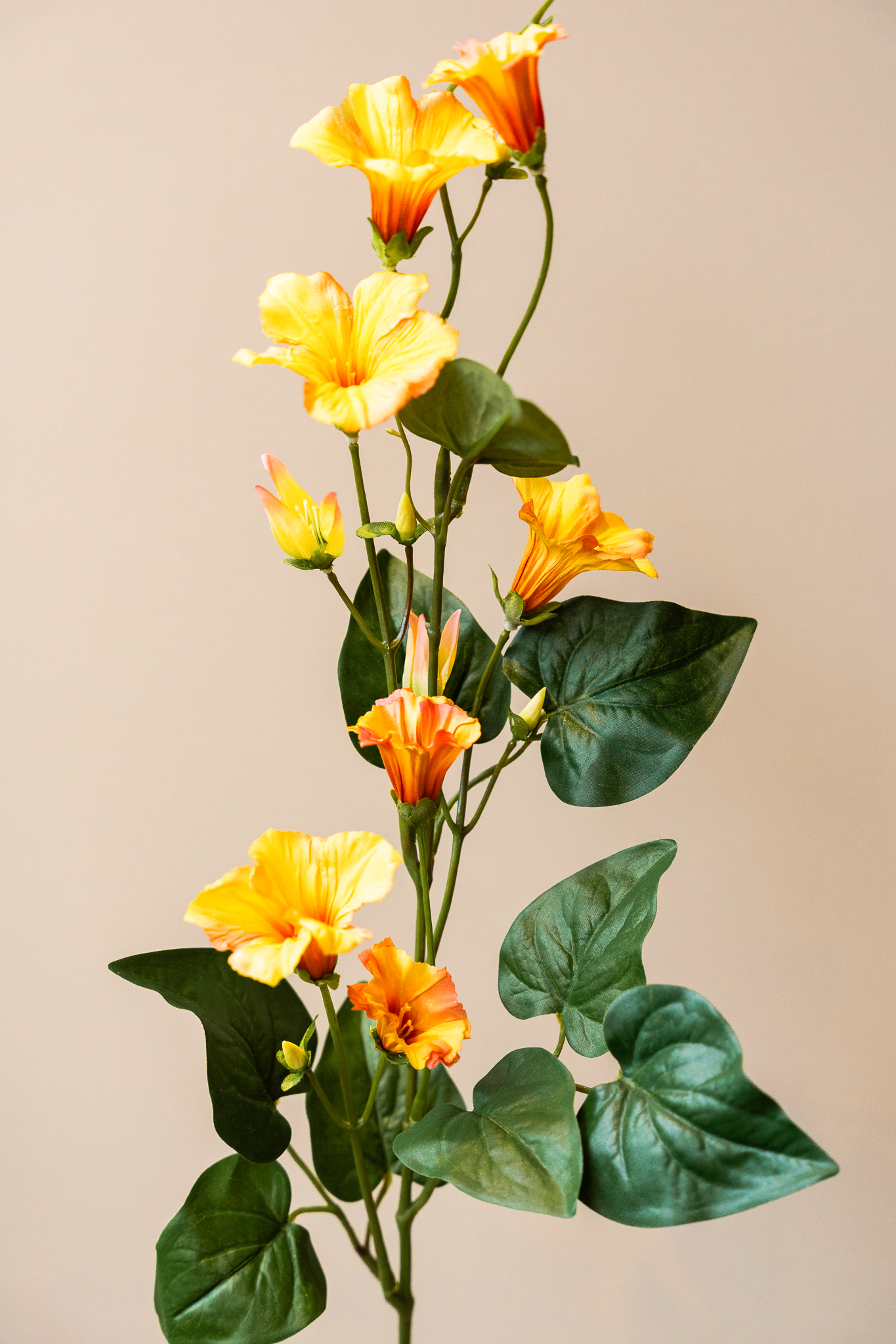 De zijden Petunia Spray is een veelzijdige bloem die prachtig tot zijn recht komt in bijvoorbeeld een veldboeket. De levendige geel/oranje tinten en levensechte bloemblaadjes voegen een vleugje kleur en verfijning toe aan ieder interieur. Een van onze bestsellers.