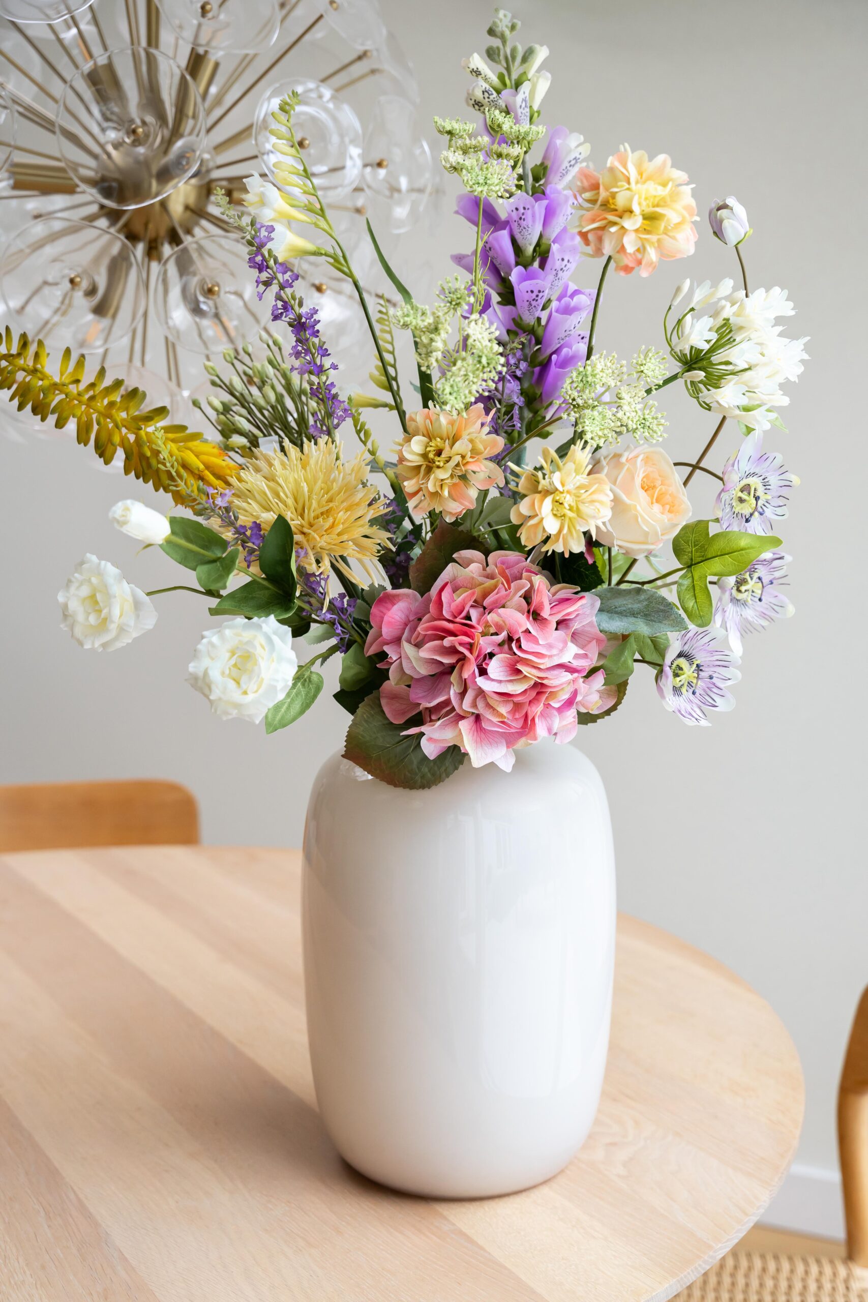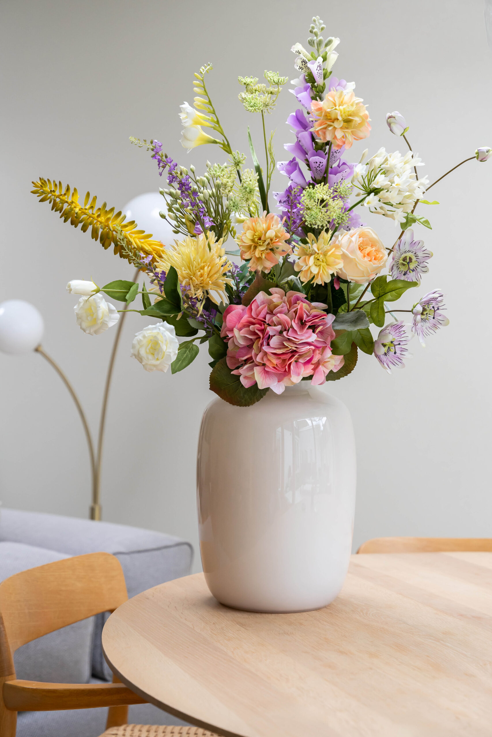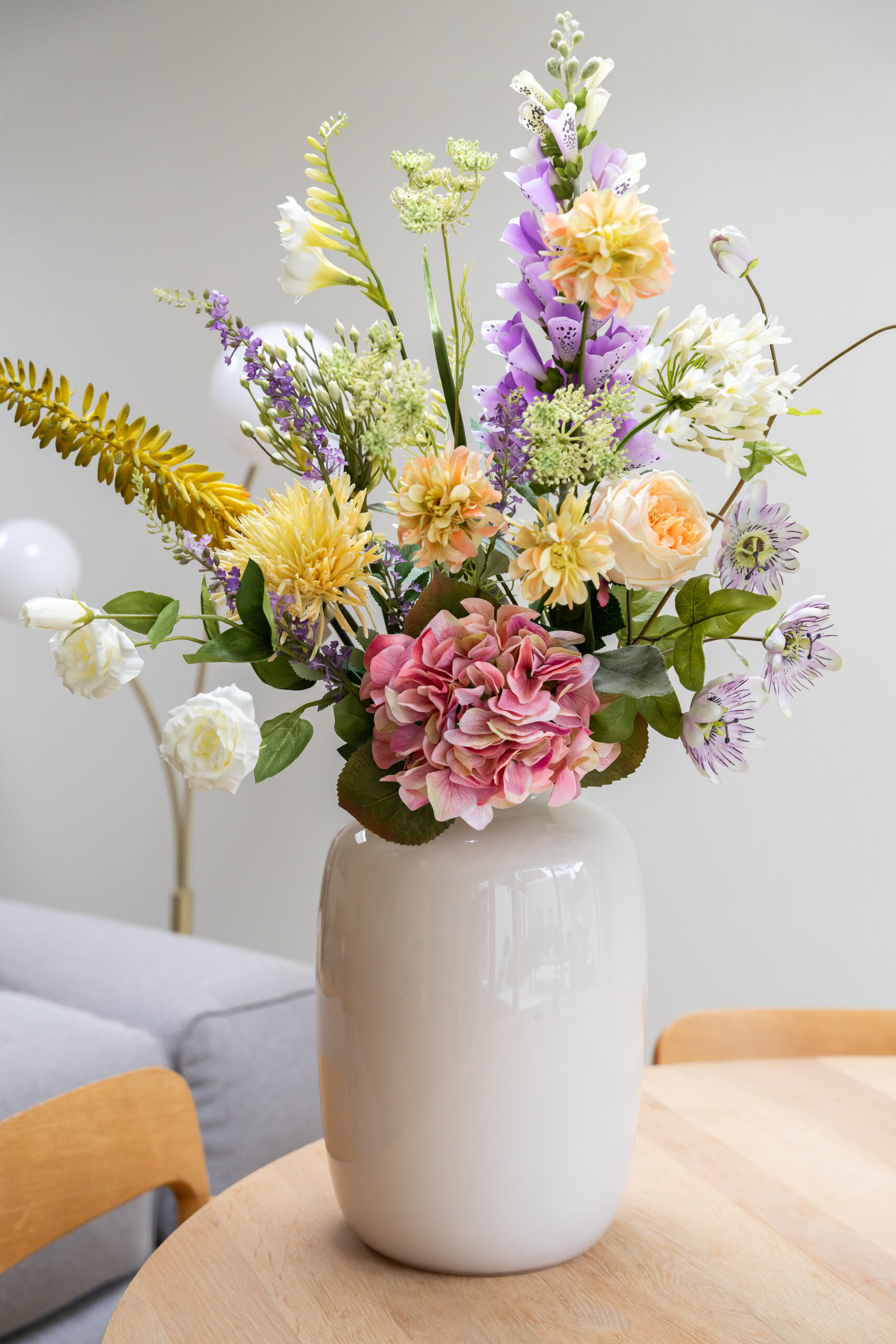 1x Chrysant Yellow, 2x Kniphofia Yellow, 1x Queen’s Ann Green, 1x Freesia White, 1x Passionflower,