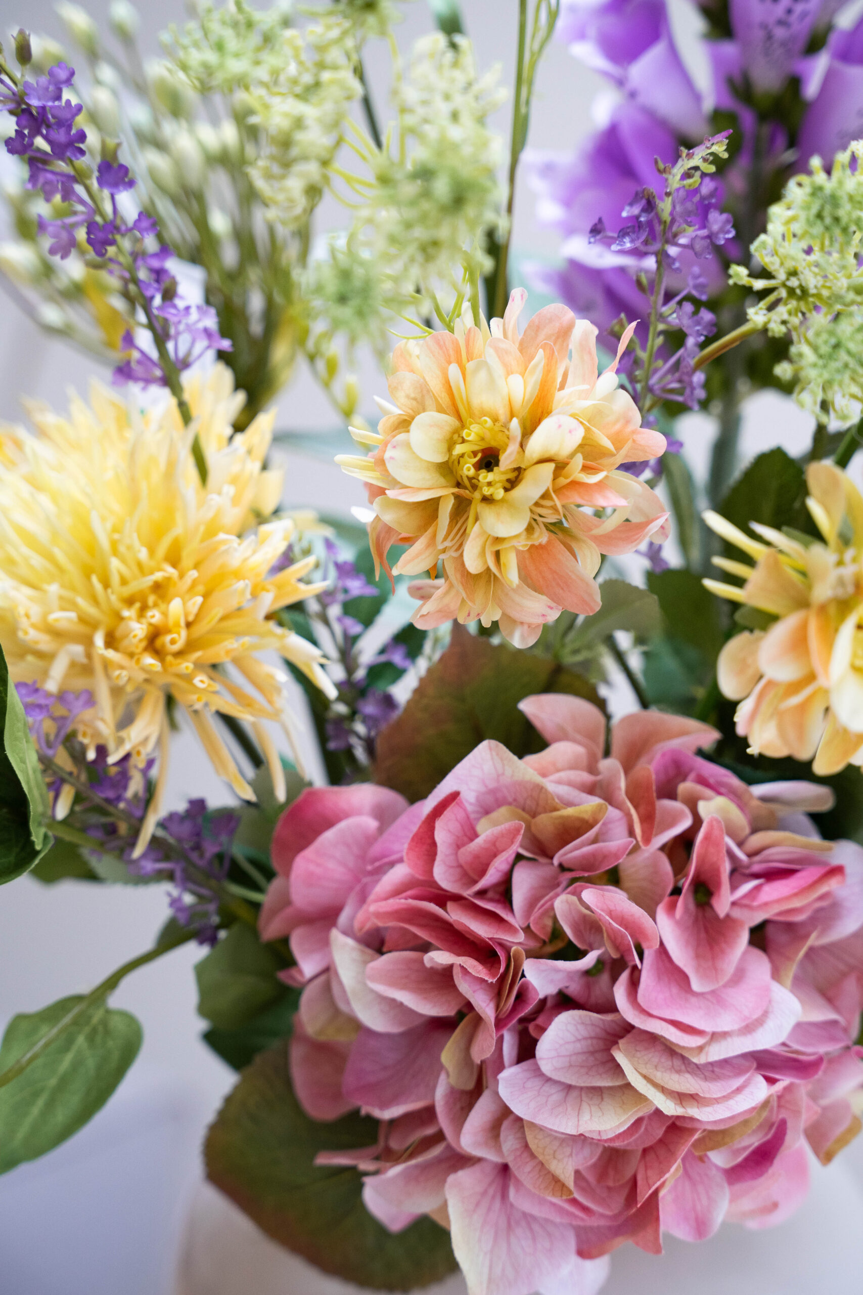 - Dit boeket bevat: 1x Digitalis Spray Lila, 1x Scabiosa Yellow, 1x Agapanthus wit, 1x Vlinderstruik,