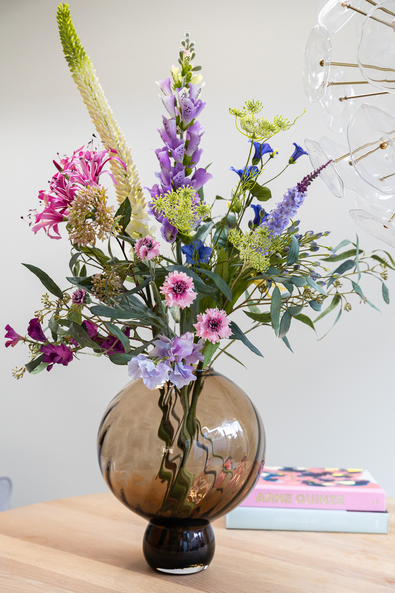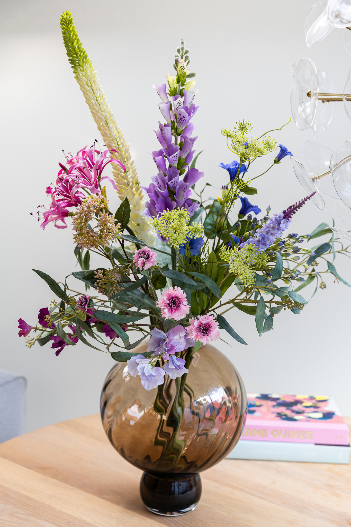 • Dit boeket bevat: 2x Mango Spray Green, 1x Digitalis Spray Lila, 1x Allium Buds, 1x Nerine Lichtroze,
