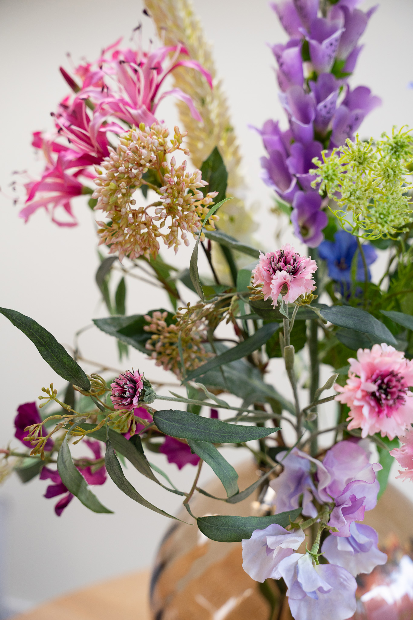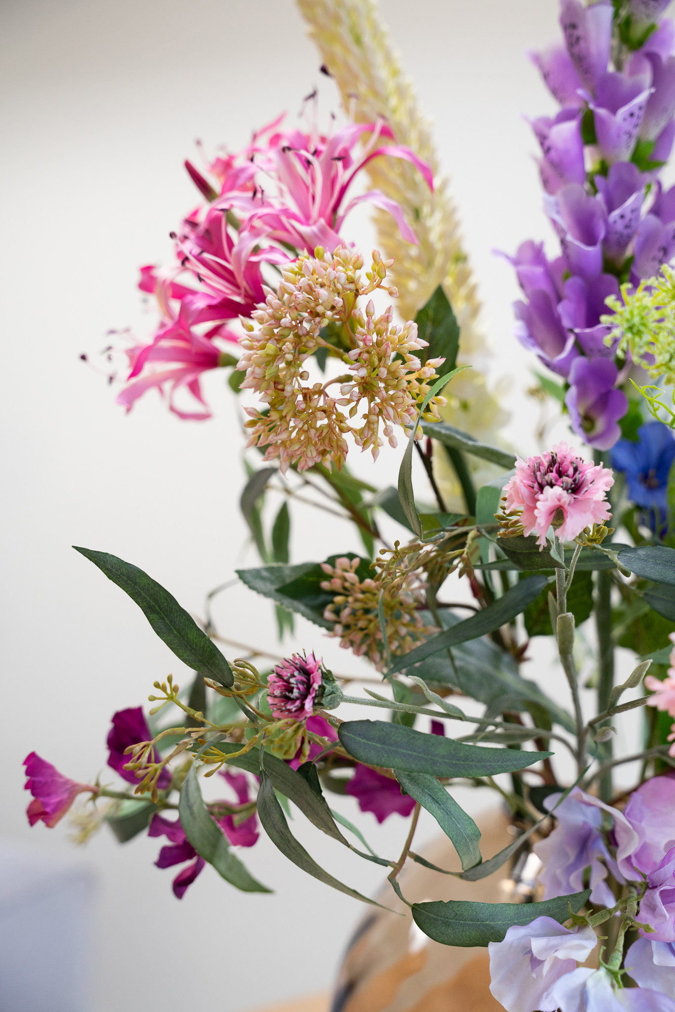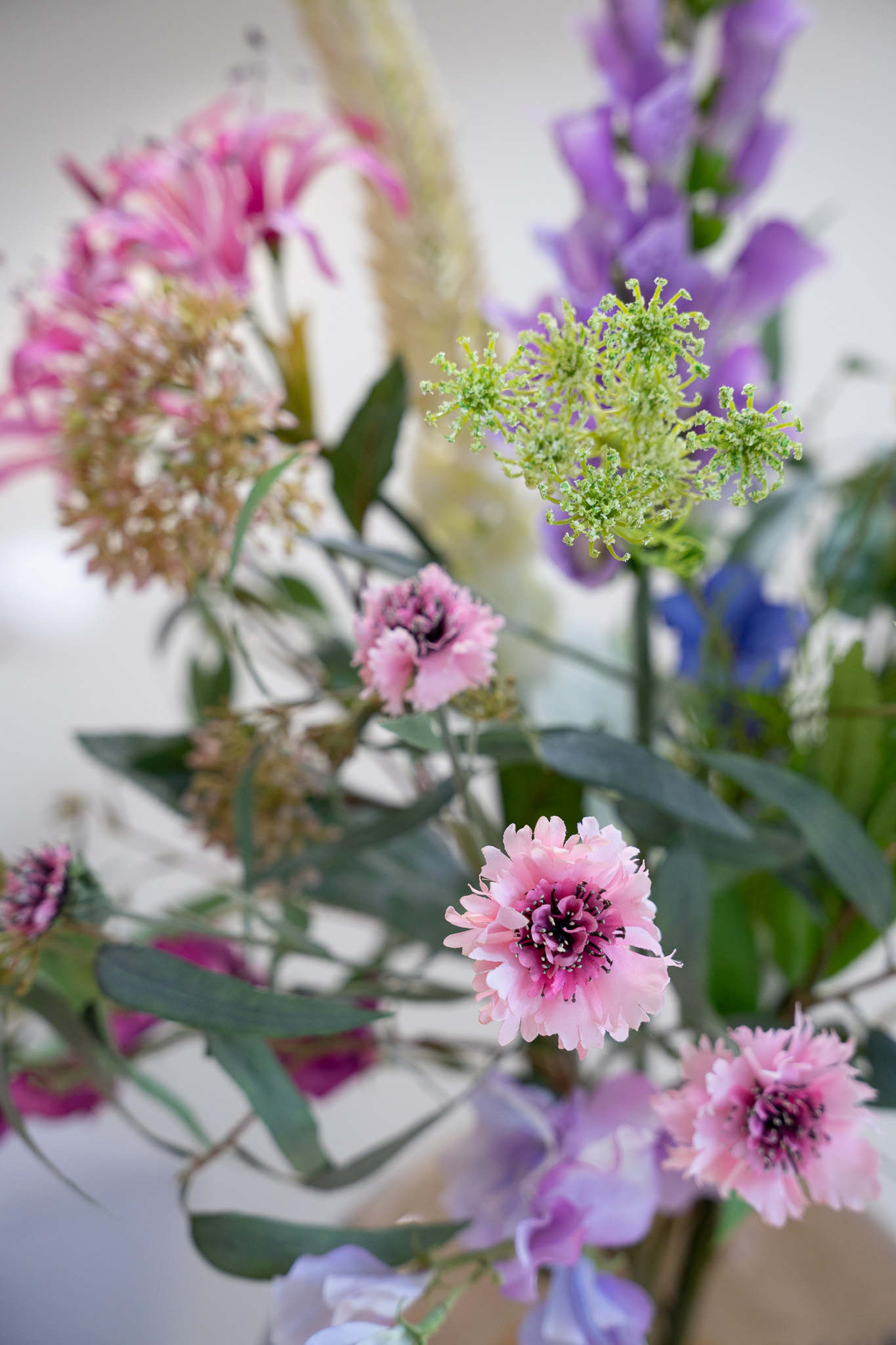 Dit prachtige zijden boeket bevat veel verschillende paars en roze tinten met een hint van wit en lichtgroen. De verschillen in hoogte en textuur maakt dit boeket echt een lust voor het oog, en een plaatje om in huis te hebben. Perfect om de lente mee in huis te halen.