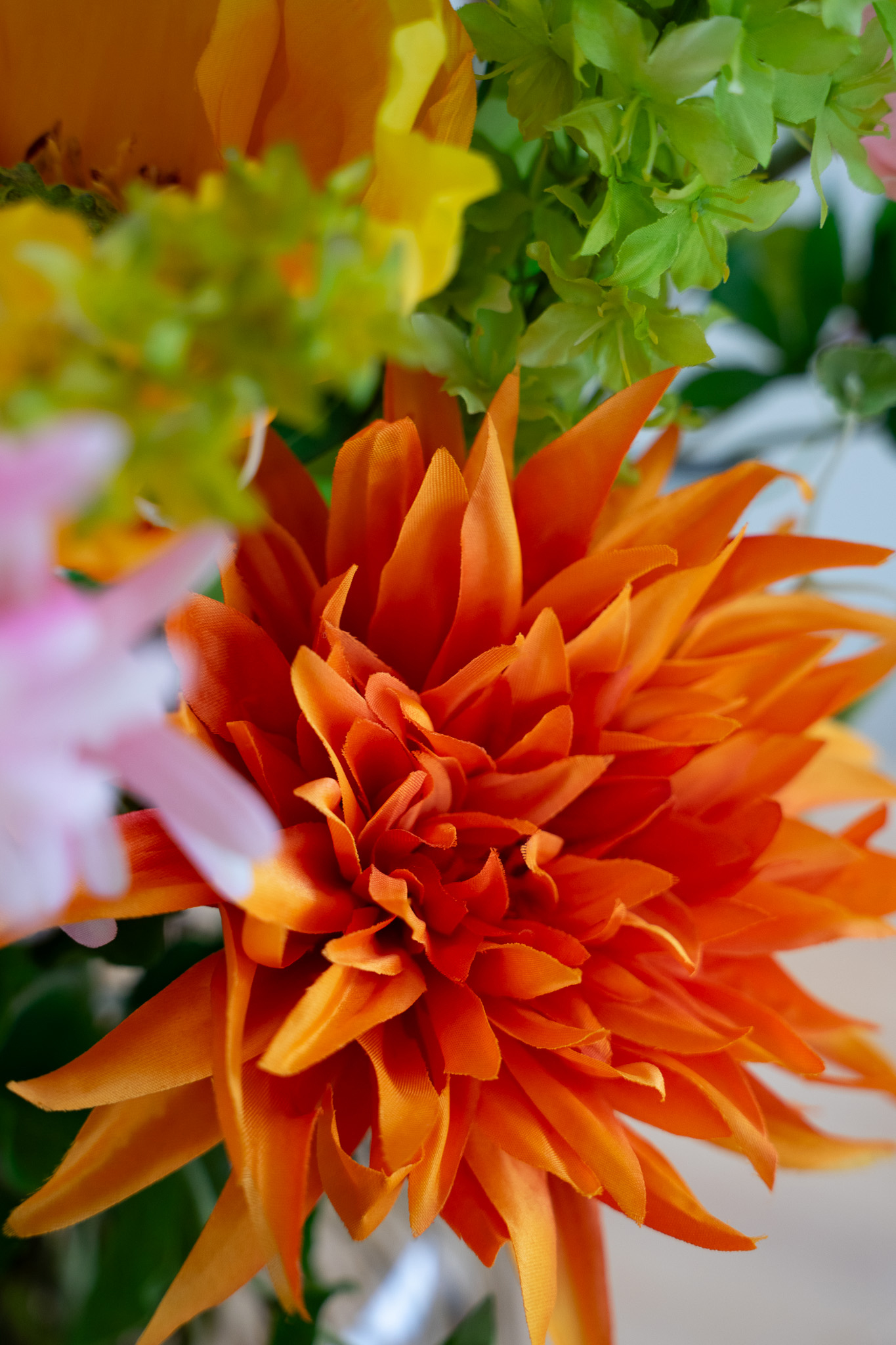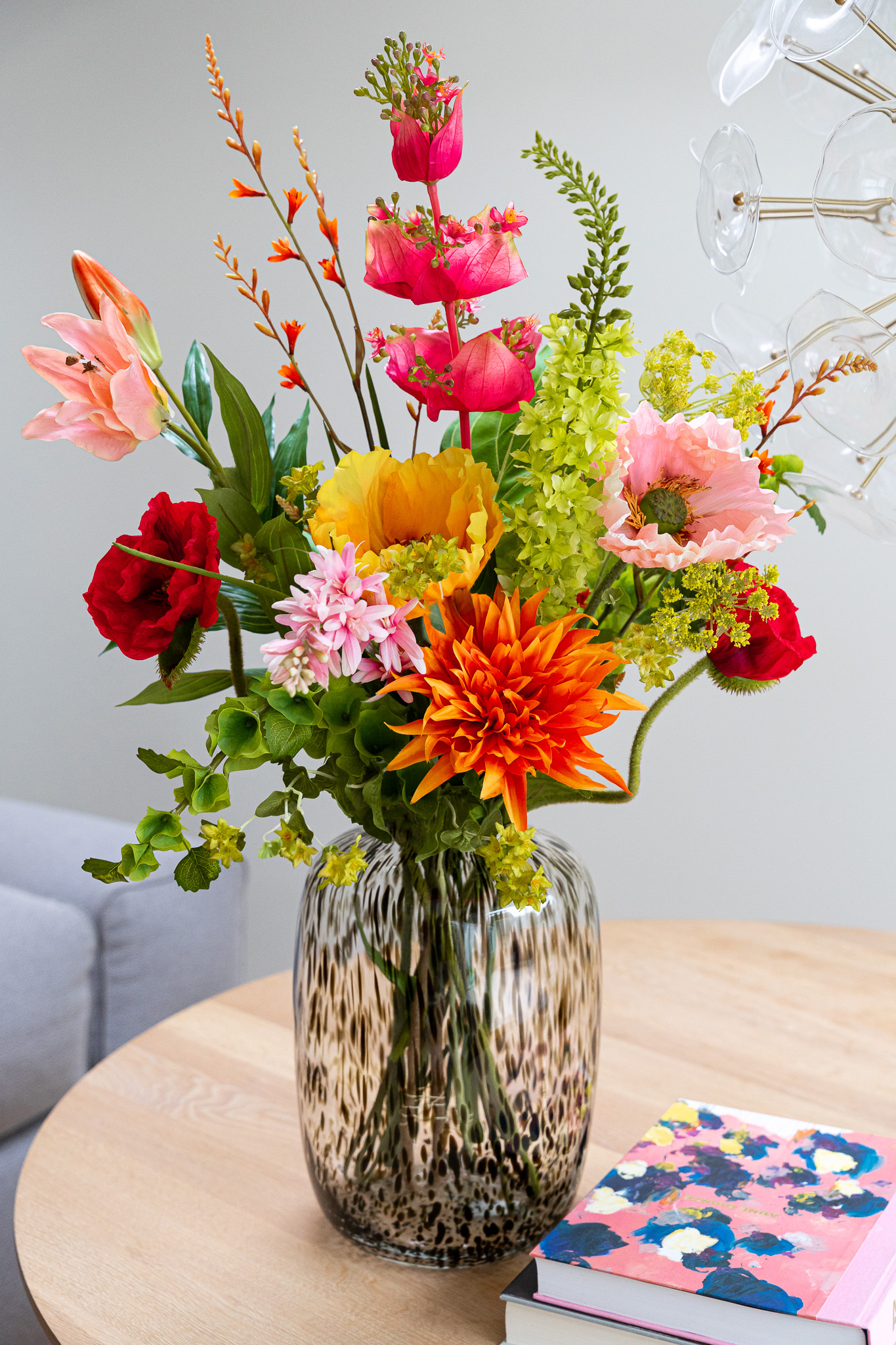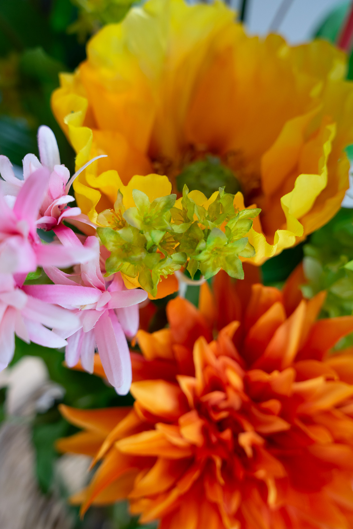 1x Bupleurum Green, 1x Bells of Ireland, 1x Dille Geel, 1x Papaver Big light orange, 1x Lily Orange, 1x Papaver Big light pink, 1x Tuberrose Pink