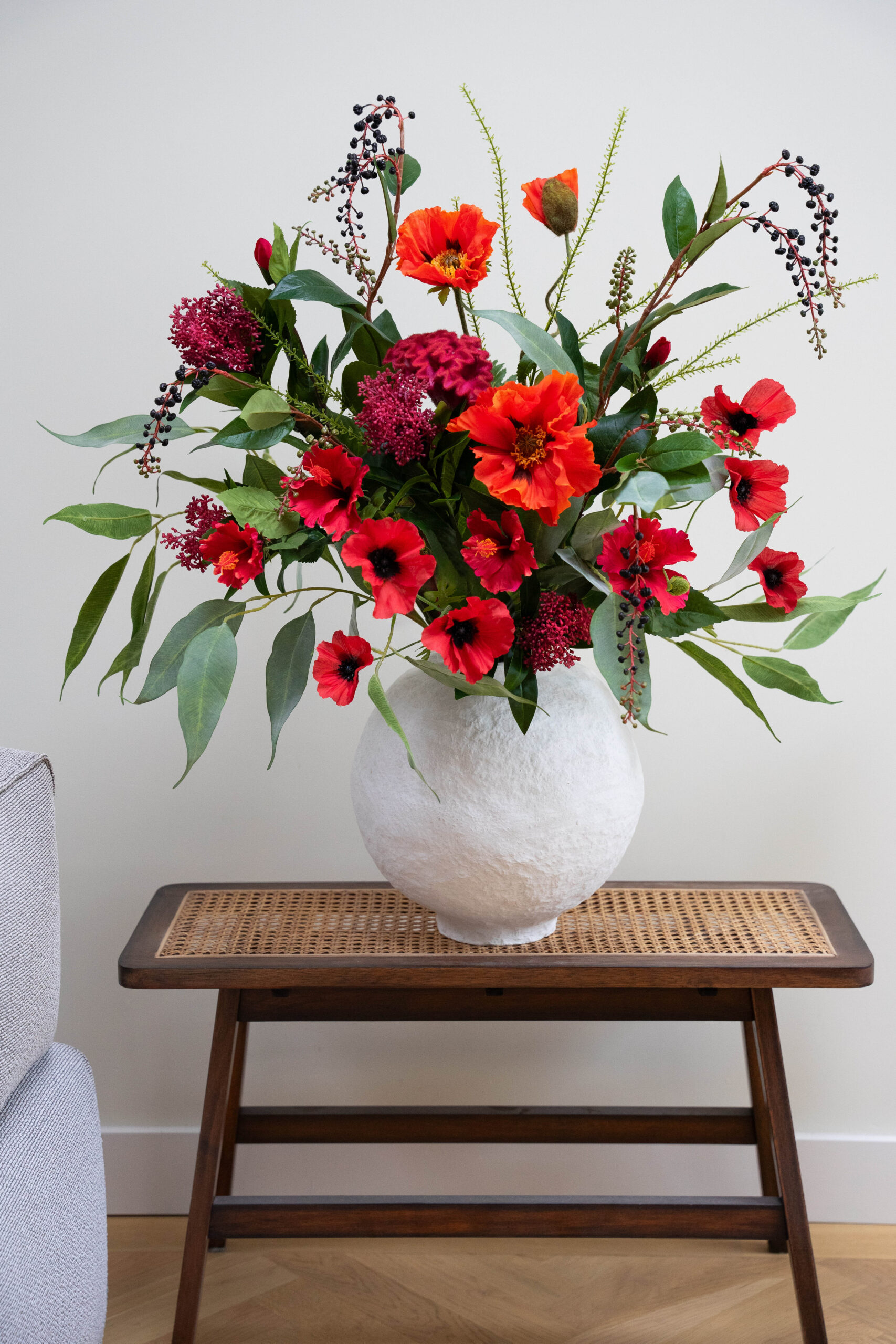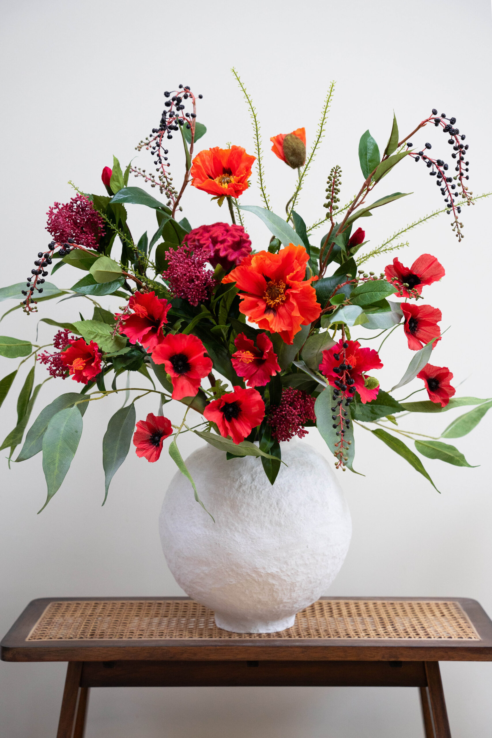 • Dit boeket bevat: 2x Mango Spray Green, 1x Baby Fern, 1x Poppy Red L, 2x Poppy spray red,