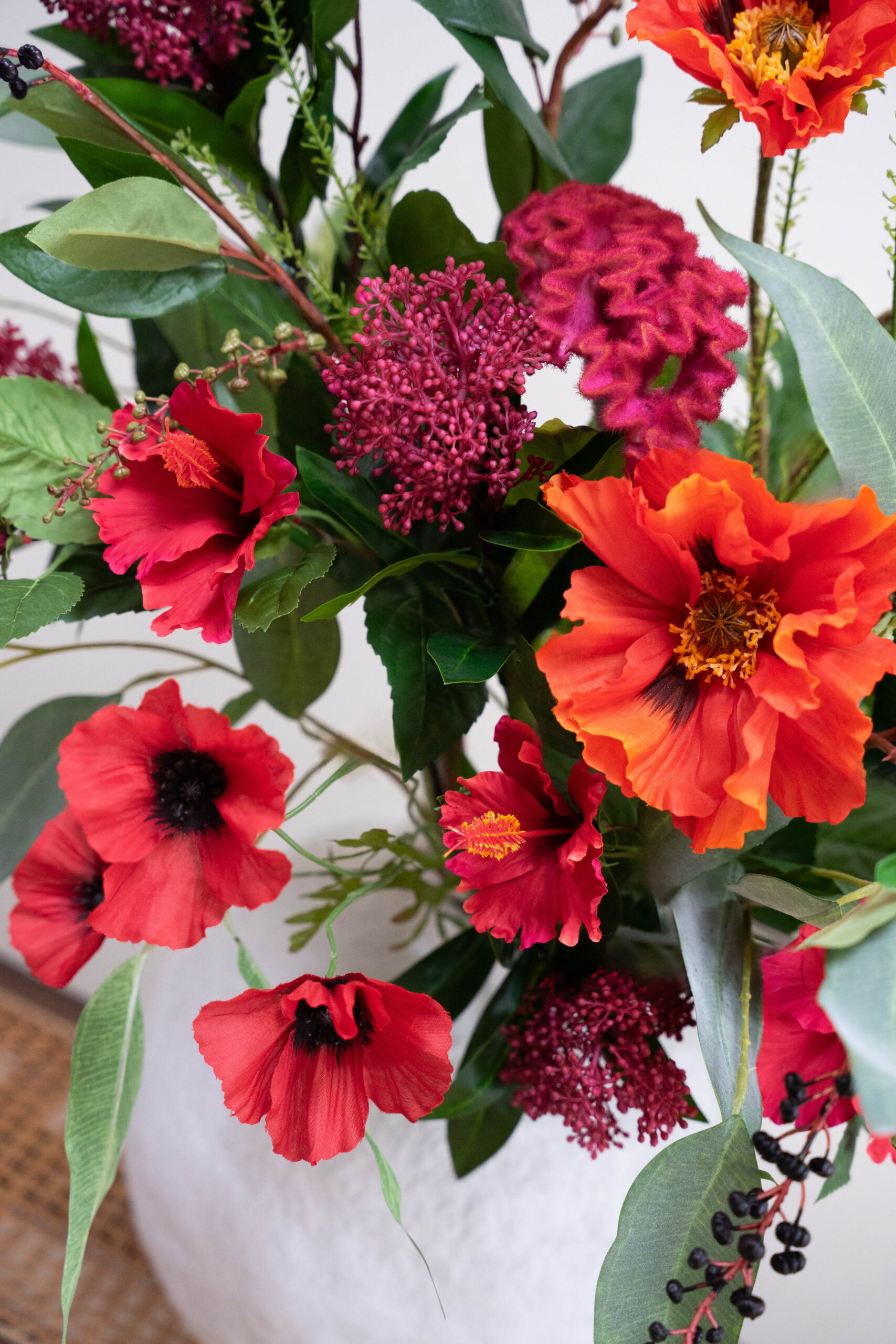 Dit prachtige zijden boeket bevat veel verschillende roodtinten gecombineerd met fris groen en zwart. De verschillen in hoogte en textuur maakt dit boeket echt een lust voor het oog, en een plaatje om in huis te hebben. Perfect om de lente mee in huis te halen.