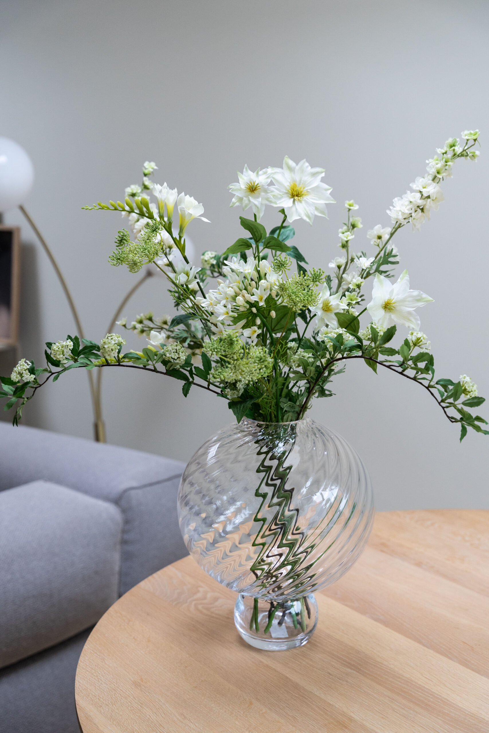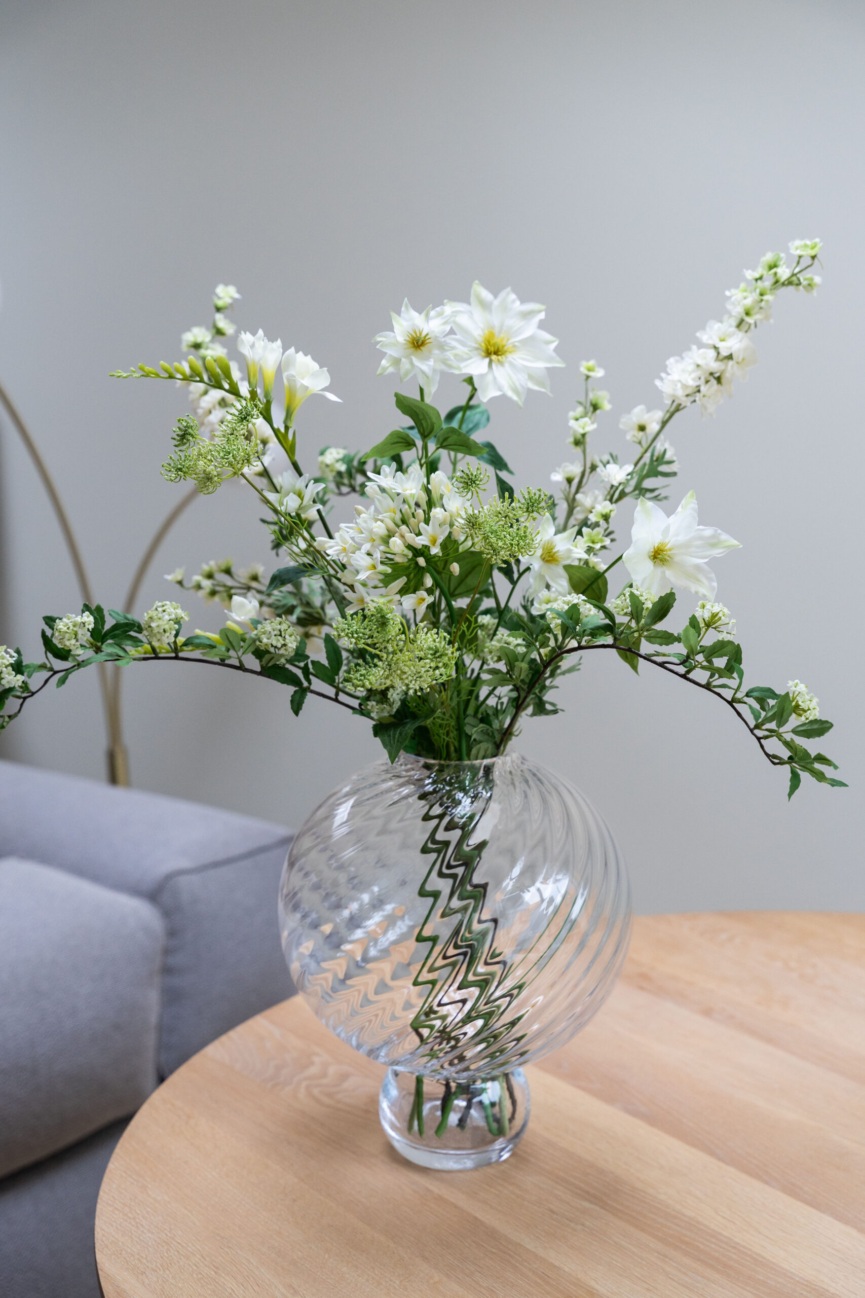 Love Of My Live, een prachtig elegant zijdenboeket. Fris wit gecombineerd met groen zorgt voor een tijdloos en rustig silkflowers boeket. Laat de ruimte stralen op een subtiele manier.