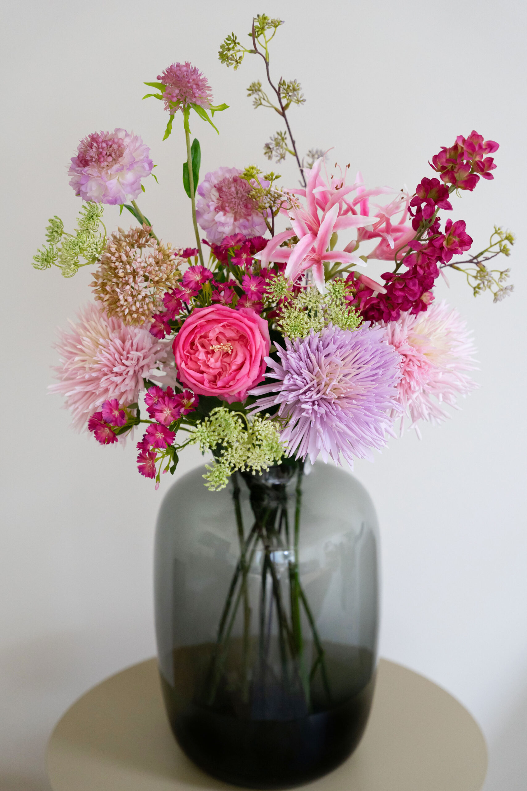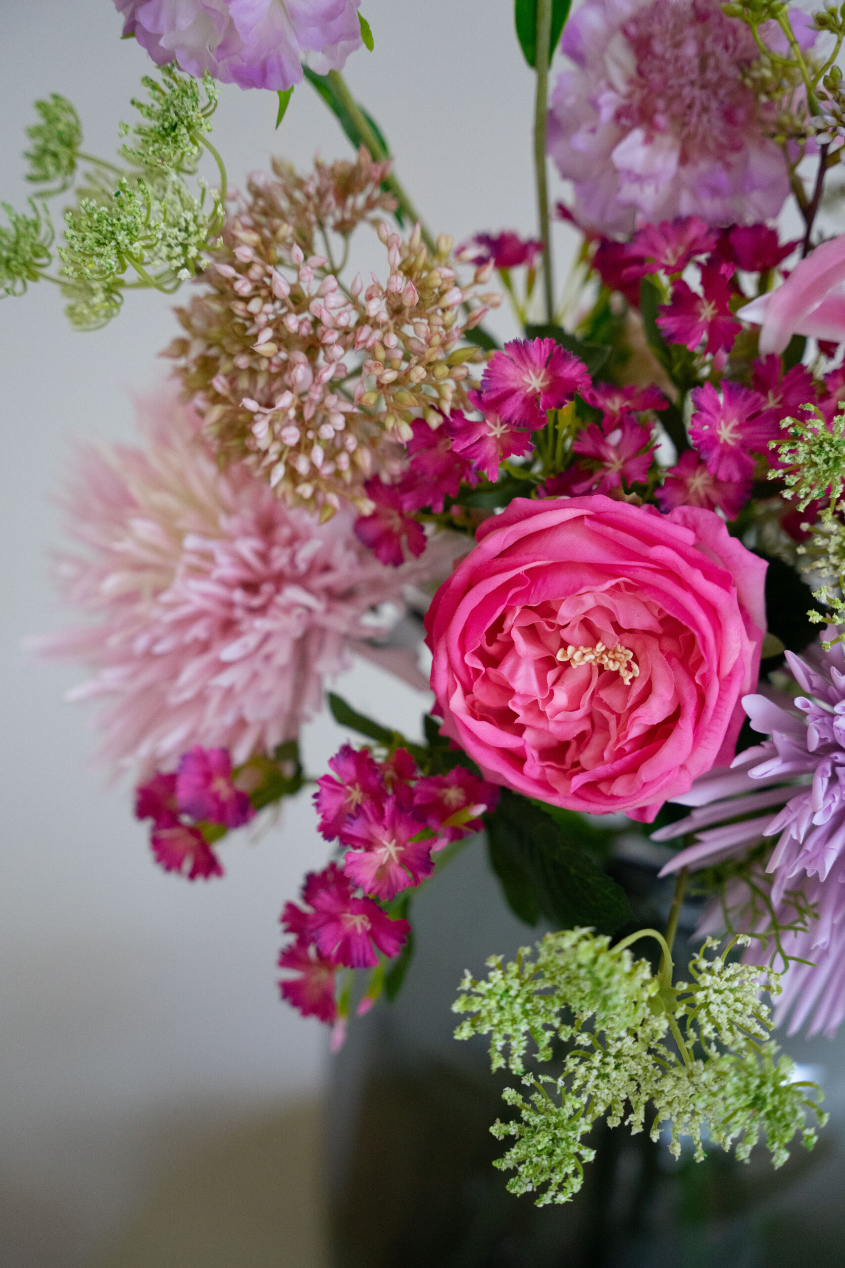 - Dit boeket bevat: 1x Delphinium Pink, 2x Chrysant Pink, 1x Chrysant Lila, 1x Rose Pink Open